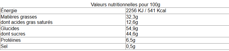 Sucre, noisettes, amandes, beurre de cacao, pâte de cacao, lait entier en poudre, beurre laitier (lait), matière grasse laitière anhydre (lait), lécithine de tournesol et soja, lactosérum en poudre, protéines de lait, sel, poudre à lever : carbonate acide de sodium, farine de malt d'orge(gluten), sel ,vanille naturelle, farine de froment (gluten), lait, autres fruits à coque (traces).