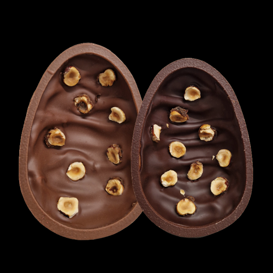 Découvrez nos oeufs au chocolat au lait ou chocolat noir, garnis de praliné noisette et décorés de noisettes caramélisées.